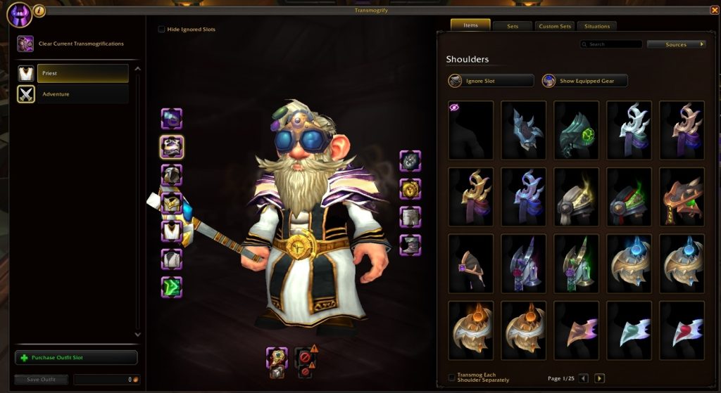 За замовчуванням доступні два слоти для трансмогу, але можна придбати до 20 слотів на персонажа. Вартість кожного наступного слоту зростає — від 100 золотих до 100 000. Після купівлі перемикатися між трансмогами можна безкоштовно. До того ж, Outfits можна перетягувати на панель дій для швидкої зміни.