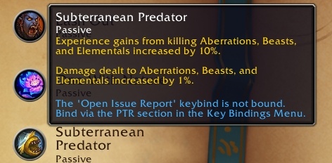 - Subterranean Predator — отримання досвіду за вбивство аберацій, звірів та елементалів збільшене на 10%. Шкода, завдана абераціям, звірям та елементалям, збільшена на 1%.