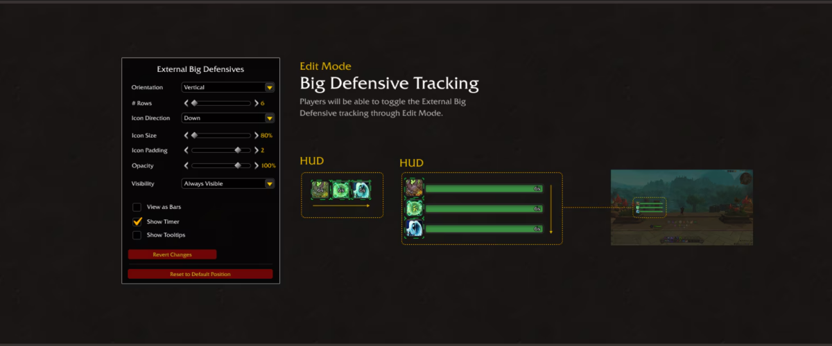 Коли функція активована, зовнішні бафи дублюються в окремому вікні для кращої видимості. Це зручно для підсвічування важливих захисних здібностей, але можливості залишаються обмеженими. Можна бачити активні здібності, як Pain Suppression, але тільки якщо вони накладені на вас – немає можливості дізнатись, чи доступна здібність із 4-хвилинним кудлауном, або вона знаходиться в стані кудлауну, тому що була використана на іншого гравця. Важлива проблема координації залишається невирішеною.