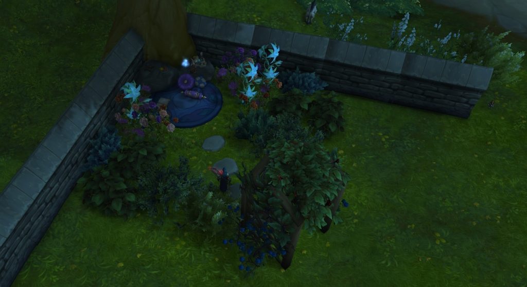 Цей маленький куточок має чимало невеликих кущів та рослин, але, що дивно, більша частина бюджету для цього конкретного будинку фактично витрачається на менш деталізовані об’єкти. Периметр будинку використовує Gilnean Stone Wall, який має «вагу» декору 5, і просто огородження третини ділянки становить 70/200 пунктів декору.