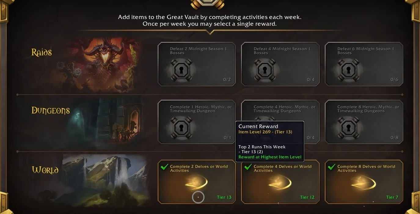 Як і делви, полювання Prey, події в зонах та щотижневі завдання, проходження Ritual Sites також зараховується до світової гілки (World track) нагород у Great Vault, масштабуючись залежно від рівня складності. Хоча рівні 1–3 дають лише спорядження рівня Champion, Ritual Sites рівнів 4 і 5 роблять значний стрибок до 2/6 і 4/6 Hero відповідно. Це робить Tier 5 Ritual Sites найвищим джерелом рівня предметів серед щотижневих нагород відкритого світу в Great Vault у патчі 12.0.5.