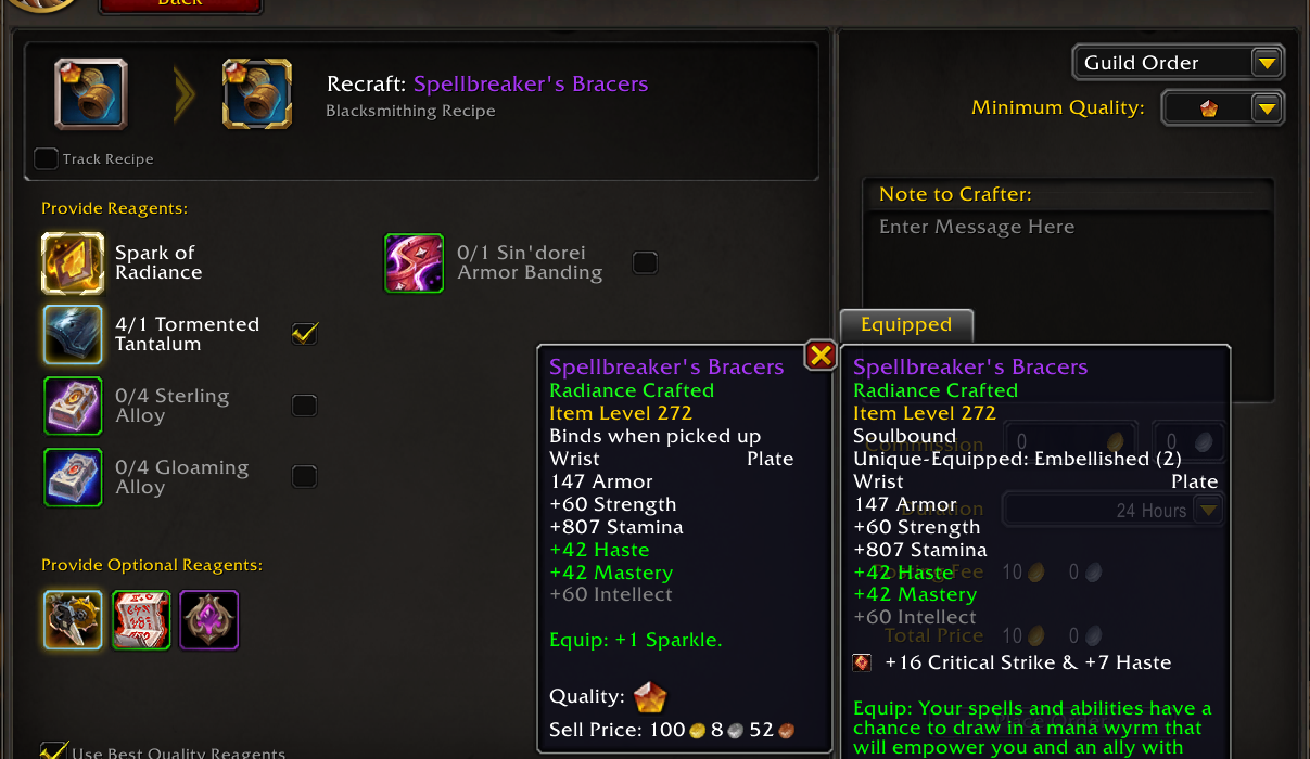 Важливо зазначити, що це працює лише для embellishment, які були додані через optional reagents, наприклад Darkmoon Sigil: Hunt або Arcanoweave Lining. Предмети, які мають вбудований embellishment за замовчуванням, не можна змінити або прибрати.