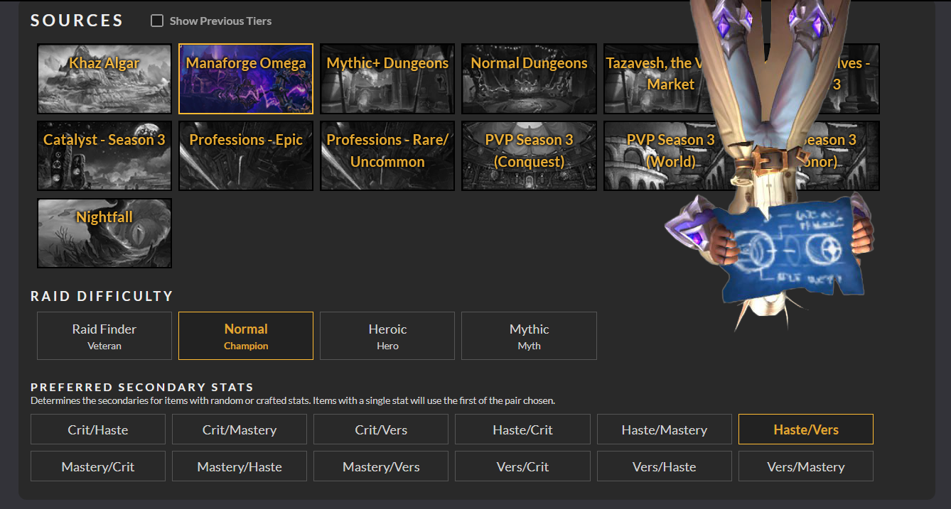 Тепер необхідно обрати "пул луту". DROPTIMIZER дозволяє засімити одразу багато айтемів з одного джерела, наприклад - рейду. Обираємо поточний Manaforge Omega, ставимо, наприклад, Normal та обираємо бажані стати для шмоток з рандомними статами і проками .
