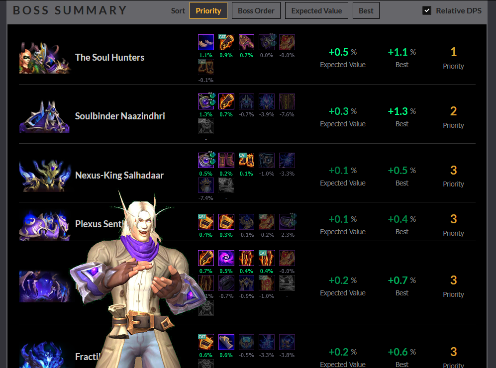 На виході маємо табличку яка показує вам наскільки зміниться ваш дпс при наявності кожної окремої шмотки. Тепер ви знаєте заздалегідь що вам потрібно від рейду, а що ні!