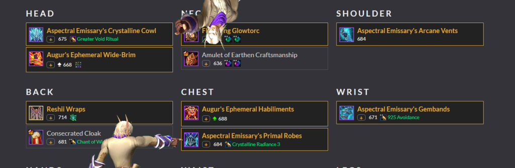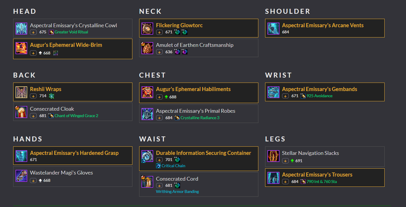 Тепер ви бачите, що все ваше спорядження, поділене на типи слотів. Підсвічені з початку речі - вдягнені, решта - лежать в сумці. Якщо ви відкрили Great Vault, але ще не обрали шмотку в інвентар і зробили копію тексту через /simc, то тут ви побачите спорядження, що лежить в вашому Great Vault з поміткою GV. Так можна дізнатись що саме є для вас кращим апгрейдом.