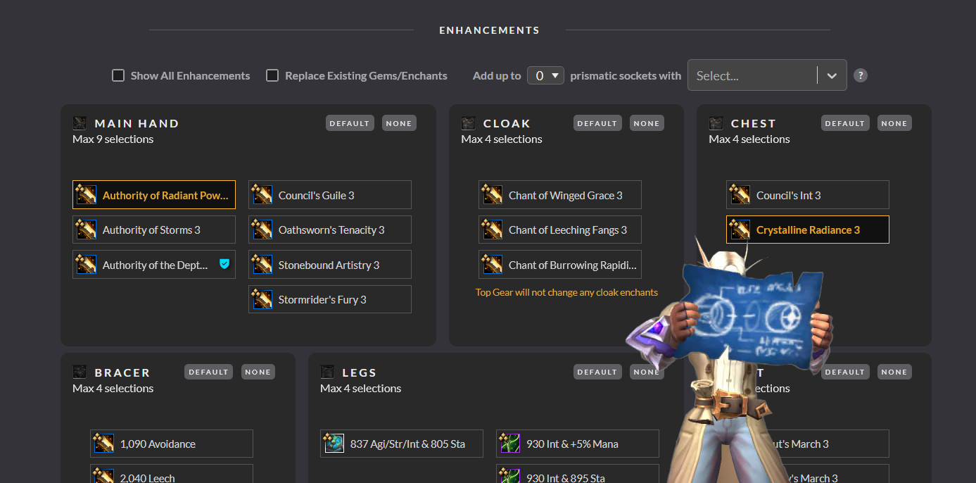 Далі йдуть чарки та геми . Ви можете вказати які чарки та геми автоматично вставляти в доступні слоти в шмотки. Якщо у вас буде декілька речей в один слот з різними чарками та гемами, сайт вас про це попередить червоним текстом.