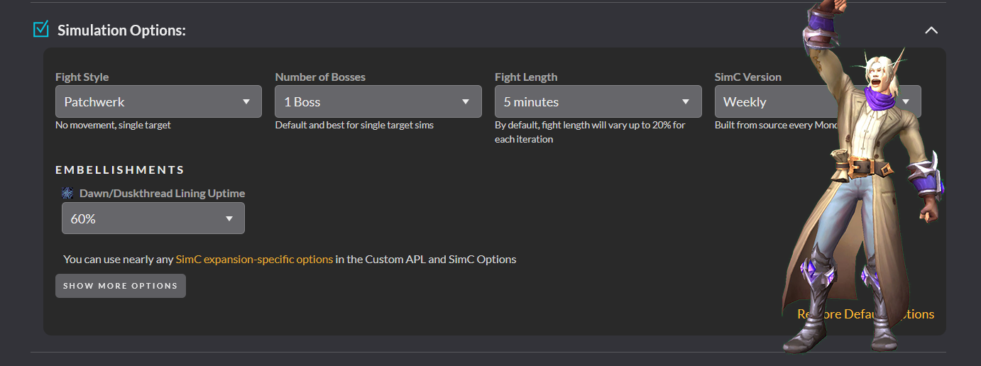 Далі переходимо до Simulation Options, тут обираємо в яких умовах буде відбуватись "симульований" файт. Стандартний набір - Patchwerk / 1 boss / 5 min.
