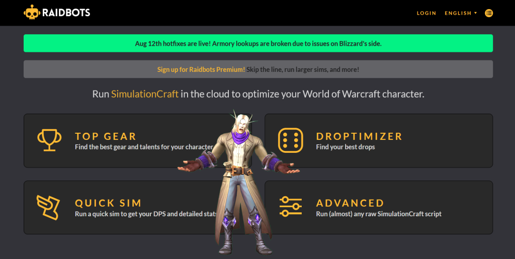 Тепер ми чекаємо поки до нас дійде черга. Raidbots можна використовувати безкоштовно і очікування в черзі в цілому - основне обмеження. Інше обмеження - кількість "варіантів" симуляції. Обидві ці штуки вирішуються платною підпискою на raidbots, якщо вам це необхідно. Але безкоштовної повинно вистачити з головою. Черги зазвичай не дуже великі навіть в день ресета (хвилин 10 максимум), а великі вибірки речей можна поділити на менші.