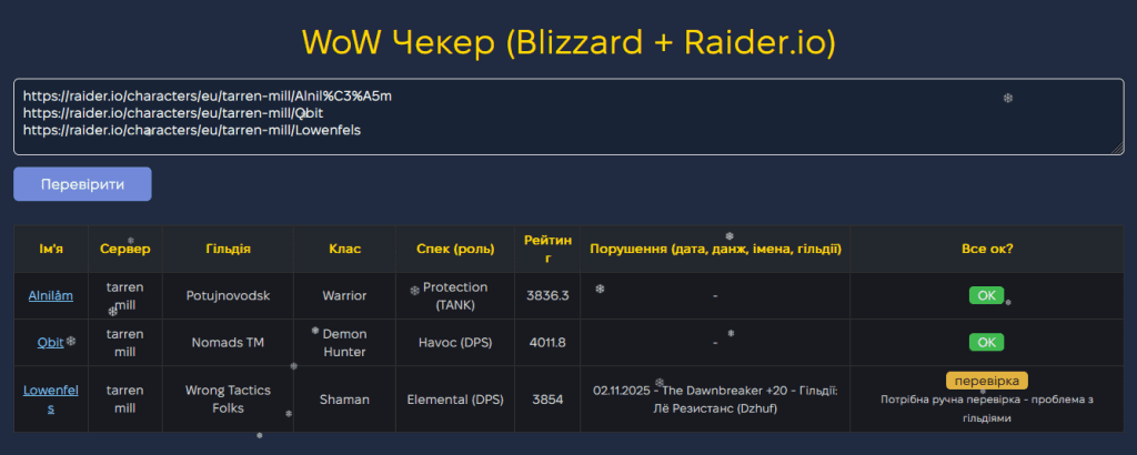 Інструмент не дає 100% гарантію, бо API Blizzard і Raider.IO не віддає всі забіги персонажа.